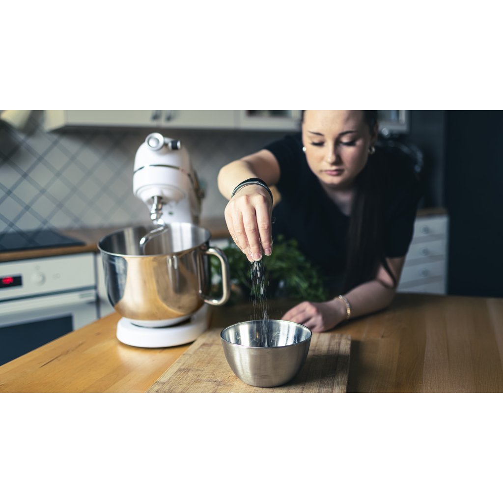 Bolul extra-mare de 6 litri este fabricat din oțel inoxidabil SUS304 de înaltă calitate și poate conține până la 2,7 kg de aluat (echivalentul a aproximativ 1,5 kg de făină). Aceasta este cantitatea suficientă pentru a coace trei pâini mari dintr-o singură preparare! În plus, mânerul ergonomic practic asigură o manipulare ușoară a bolului, chiar și atunci când preparați porții mai mari pentru familie sau prieteni. Capacul transparent pentru turnare menține curățenia în bucătărie chiar și în timpul mixării intense.