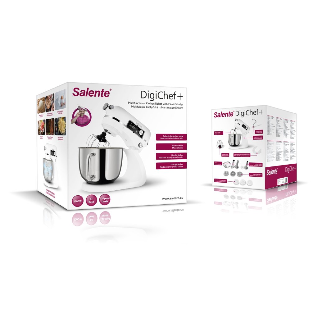 Salente DigiChef+ nu este doar un aparat de bucătărie. Acest robot de bucătărie combină șase funcții diferite (frământare, amestecare, batere, tocare carne, preparare cârnați și preparare paste). Poate face totul, de la baterea cremelor aerate până la frământarea aluatului dens pentru pâine sau pizza și tocarea cărnii pentru tartar. Și nu doar atât!
