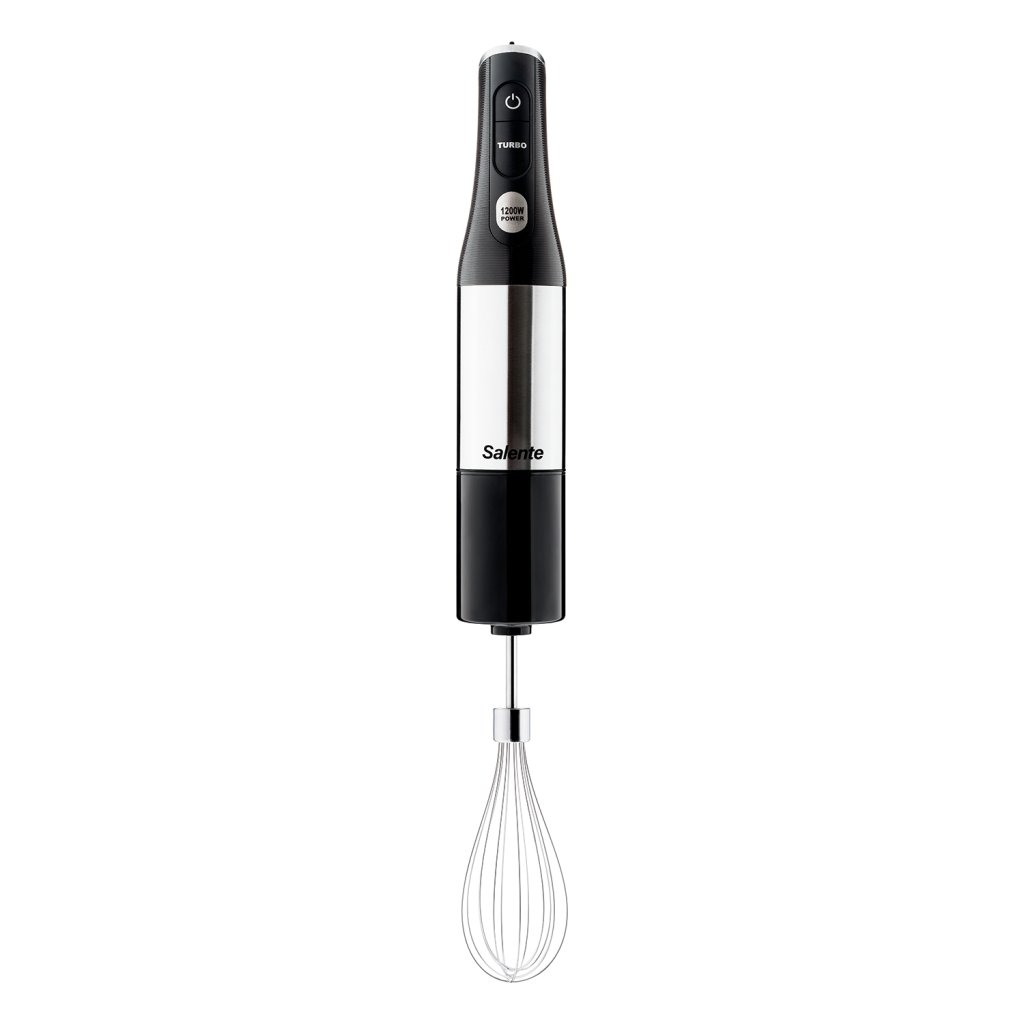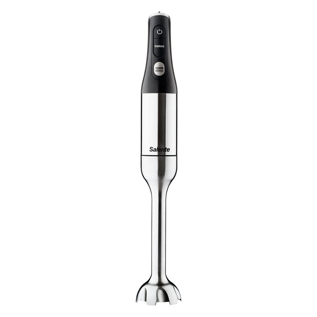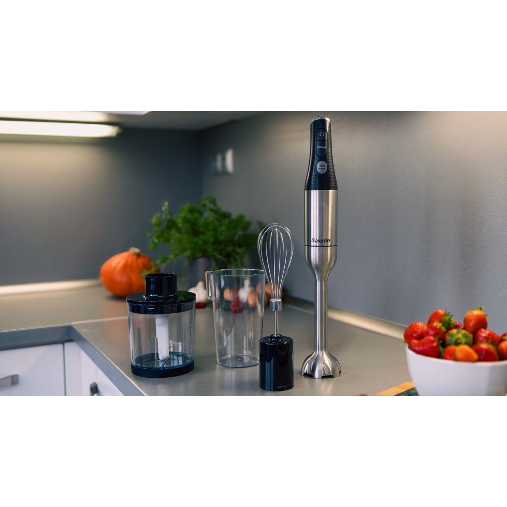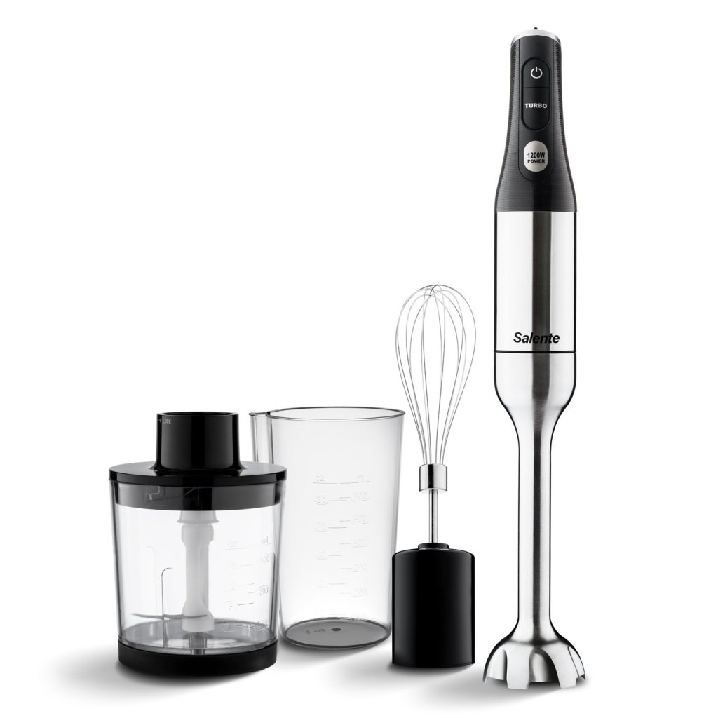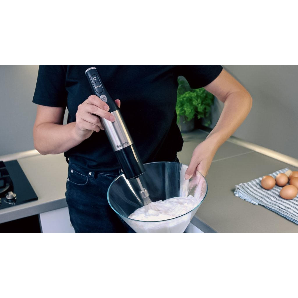Imaginați-vă că aveți la îndemână un magician pentru gătit care vă poate transforma bucătăria într-un studio culinar profesional la comandă. Iată-l. Se numește Salente Mixxo și este un blender de mână multifuncțional cu un motor de 1200W care gestionează cu ușurință trei funcții cheie. Mixează ingrediente pentru orice, de la supe cremoase la smoothie-uri și sosuri. Poate bate creme aerate, aluaturi și chiar albușuri de ou. Și se poate ocupa, de asemenea, de tocarea cărnii, a produselor de patiserie dure sau chiar a nucilor.