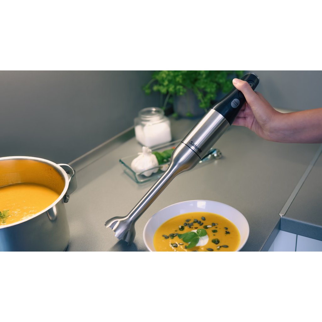 Dovada designului bine gândit al blenderului Salente Mixxo este și funcția AntiSplit care împiedică aspirarea capului blenderului în fundul recipientului. Aceasta elimină stropirea ingredientelor amestecate, astfel încât să puteți lucra cu maximă liniște, deoarece nu trebuie să vă faceți griji cu privire la mizeria din jur. În plus, tija de amestecare din oțel inoxidabil poate manipula cu ușurință alimente fierbinți și clocotite, astfel încât nu sunteți limitat nici măcar la prepararea unor delicatese mai exigente.