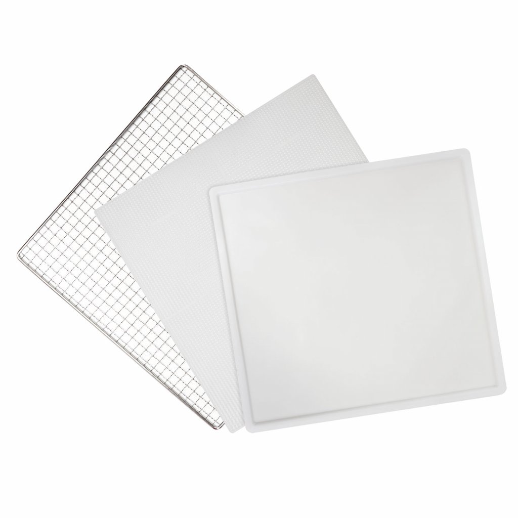 - 10 căptușeli de tavă cu ochiuri fine pentru uscarea ingredientelor mai delicate și mai lipicioase (de exemplu, ciuperci, ierburi, banane, roșii etc.)