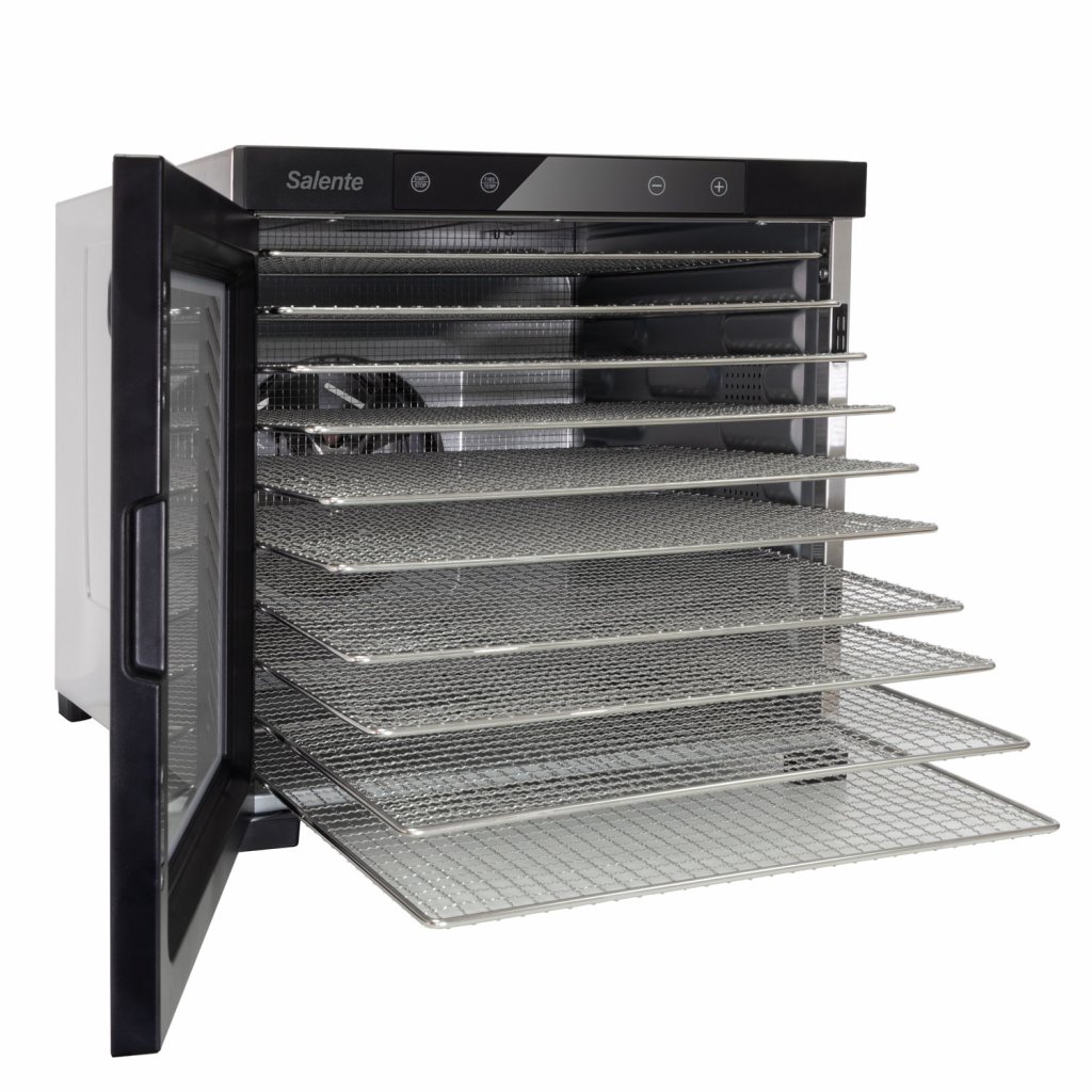 În plus, acest model dispune de un set de zece plăci de uscare cu ochiuri fine pentru uscarea ingredientelor mai fine și lipicioase (de exemplu, ciuperci, ierburi, banane, roșii etc.). De asemenea, este prevăzut cu o tavă de picurare în partea de jos a uscătorului pentru a colecta excesul de sucuri de la unele ingrediente, ceea ce face mult mai ușoară curățarea interiorului din oțel inoxidabil al uscătorului. Atât farfuria, cât și tava au dimensiunile de 39,4 × 38 cm.