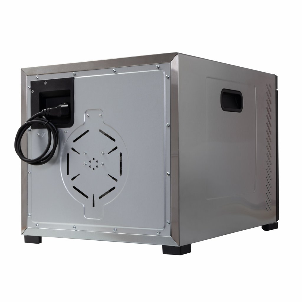 Un ventilator foarte mare, cu un diametru record de 18 cm, asigură o uscare uniformă pe toate etajele, fără a fi nevoie să rotiți materiile prime și să rearanjați plăcile de uscare. Aerul cald este distribuit pe orizontală, asigurând aceeași temperatură pe toate etajele.