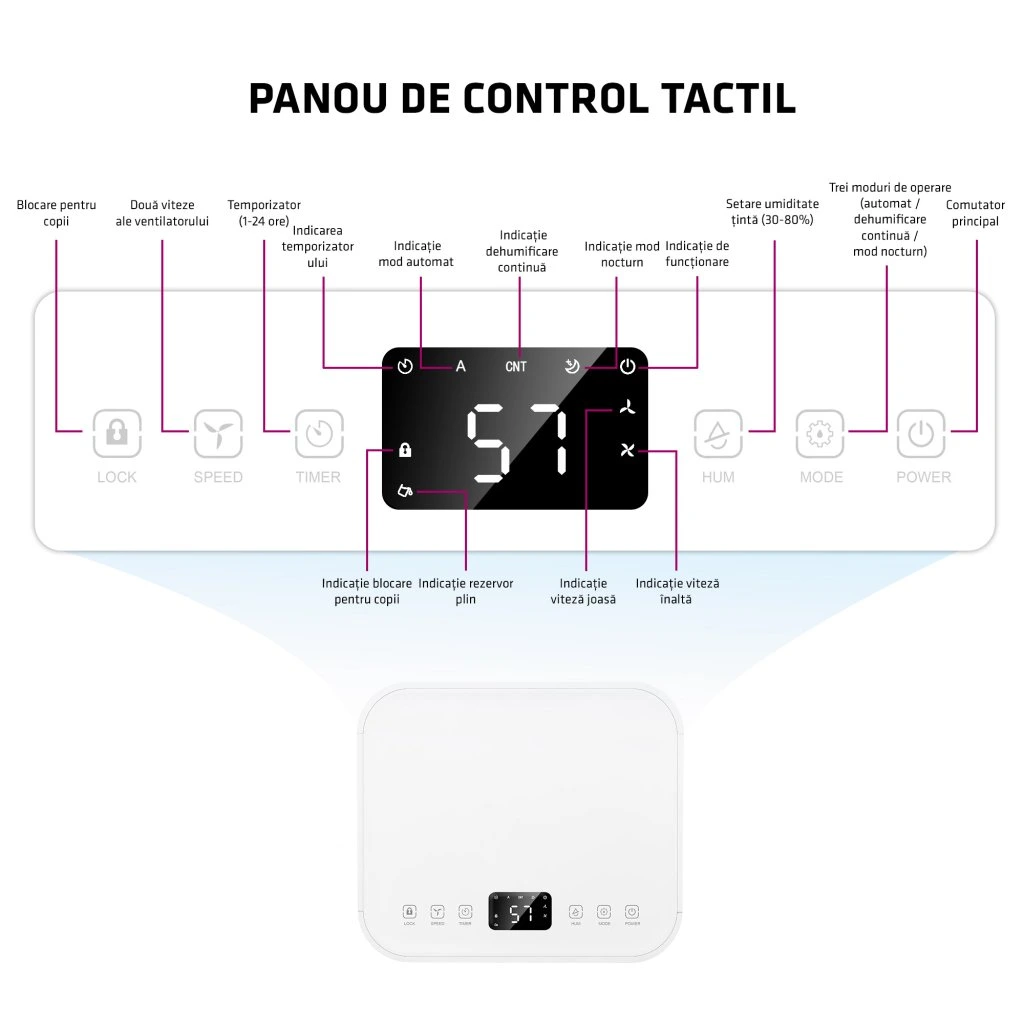 Ecranul dezumidificatorului afișează clar umiditatea curentă și dorită, viteza ventilatorului și statusul temporizatorului, care poate fi setat până la 24 de ore. În caz de cădere a alimentării cu energie, funcția AutoRestart pornește și restabilește dispozitivul exact de unde a fost oprit.